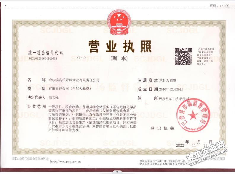 哈尔滨高氏禾田米业有限责任公司